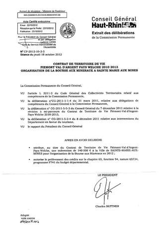 Il est proposé d’attribuer une subvention de 140 000 € à la Ville de SAINTE-MARIE-AUX-MINES pour l’organisation de la Bourse aux Minéraux en 2012, opération inscrite au Contrat de Territoire de Vie Piémont - Val d’Argent - Pays Welche.
