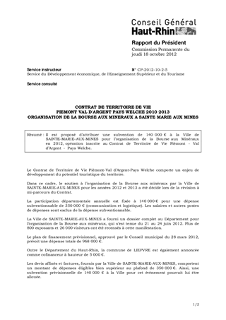 CONTRAT DE TERRITOIRE DE VIE PIEMONT VAL D'ARGENT PAYS WELCHE 2010 2013 ORGANISATION DE LA BOURSE AUX MINERAUX A SAINTE MARIE AUX MINES