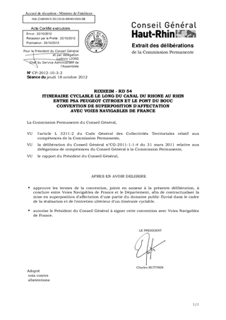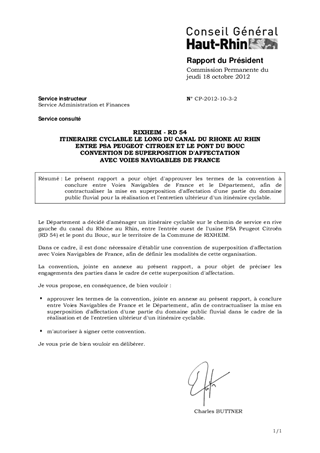 RIXHEIM - RD 54 ITINERAIRE CYCLABLE LE LONG DU CANAL DU RHONE AU RHIN ENTRE PSA PEUGEOT CITROEN ET LE PONT DU BOUC CONVENTION DE SUPERPOSITION D'AFFECTATION AVEC VOIES NAVIGABLES DE FRANCE