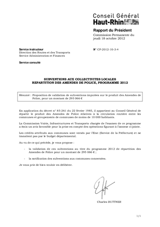 SUBVENTIONS AUX COLLECTIVITES LOCALES REPARTITION DES AMENDES DE POLICE, PROGRAMME 2012