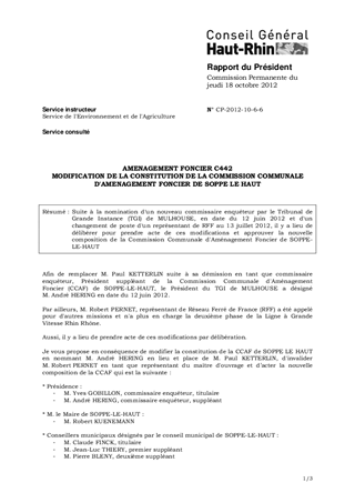 Suite à la nomination d'un nouveau commissaire enquêteur par le Tribunal de Grande Instance (TGI) de MULHOUSE, en date du 12 juin 2012 et d'un changement de poste d'un représentant de RFF au 13 juillet 2012, il y a lieu de délibérer pour prendre acte de ces modifications et approuver la nouvelle composition de la Commission Communale d'Aménagement Foncier de SOPPE-LE-HAUT