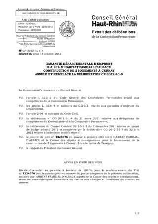 GARANTIE DÉPARTEMENTALE D'EMPRUNT S.A. H.L.M HABITAT FAMILIAL D'ALSACE CONSTRUCTION DE 2 LOGEMENTS À CERNAY ANNULE ET REMPLACE LA DELIBERATION CP-2012-8-1-5