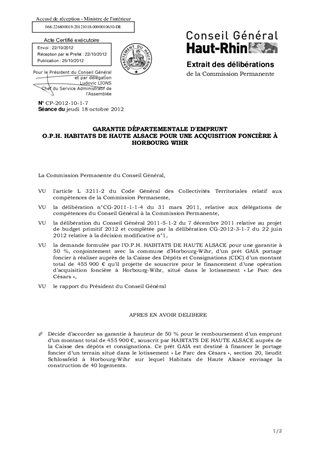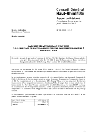 GARANTIE DÉPARTEMENTALE D'EMPRUNT O.P.H. HABITATS DE HAUTE ALSACE POUR UNE ACQUISITION FONCIÈRE À HORBOURG WIHR