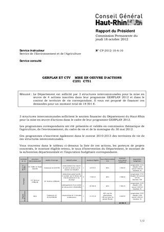 Le Département est sollicité par 3 structures intercommunales pour la mise en œuvre de 4 actions inscrites dans leur programme GERPLAN 2012 et dans le contrat de territoire de vie correspondant. Il vous est proposé de financer ces demandes pour un montant total de 18 501 €.