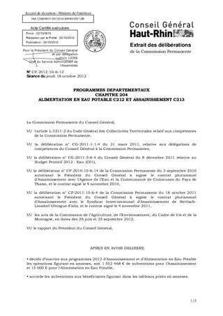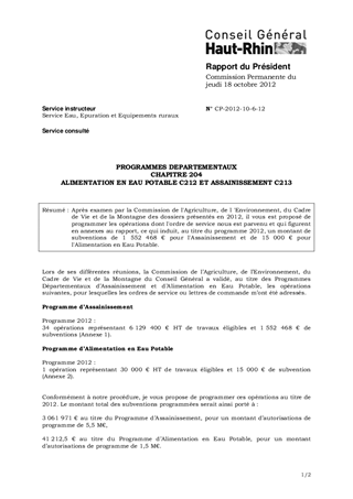 Après examen par la Commission de l'Agriculture, de l 'Environnement, du Cadre de Vie et de la Montagne des dossiers présentés en 2012, il vous est proposé de programmer les opérations dont l'ordre de service nous est parvenu et qui figurent en annexes au rapport, ce qui induit, au titre du programme 2012, un montant de subventions de 1 552 468 € pour l'Assainissement et de 15 000 € pour l'Alimentation en Eau Potable.