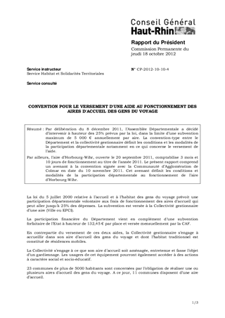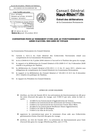 Par délibération du 8 décembre 2011, l’Assemblée Départementale a décidé d’intervenir à hauteur des 25% prévus par la loi, dans la limite d’une subvention maximum de 5 000 € annuellement par aire. La convention-type entre le Département et la collectivité gestionnaire définit les conditions et les modalités de la participation départementale notamment en ce qui concerne le versement de l’aide. Par ailleurs, l’aire d’Horbourg-Wihr, ouverte le 20 septembre 2011, comptabilise 3 mois et 10 jours de fonctionnement au titre de l’année 2011. Le présent rapport comprend un avenant à la convention signée avec la Communauté d’Agglomération de Colmar en date du 10 novembre 2011. Cet avenant définit les conditions et modalités de la participation départementale au fonctionnement de l’aire d’Horbourg-Wihr.