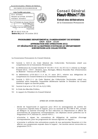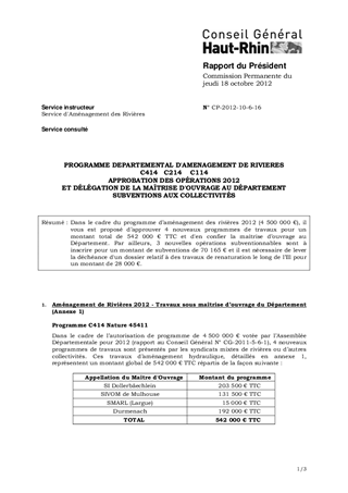 PROGRAMME DEPARTEMENTAL D'AMENAGEMENT DE RIVIERES C414 C214 C114 APPROBATION DES OPÉRATIONS 2012 ET DÉLÉGATION DE LA MAÎTRISE D'OUVRAGE AU DÉPARTEMENT SUBVENTIONS AUX COLLECTIVITÉS