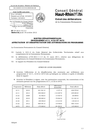 Le Règlement Financier dans son article 9.6 stipule que l’affectation et la désaffectation des Autorisations de Programme relèvent d’une décision de la Commission Permanente. Le présent rapport concerne les programmes n° A111 – A132 - A472.
