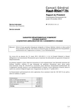 GARANTIE DÉPARTEMENTALE D'EMPRUNT COLMAR HABITAT ACQUISITION AMÉLIORATION DE 2 LOGEMENTS À COLMAR