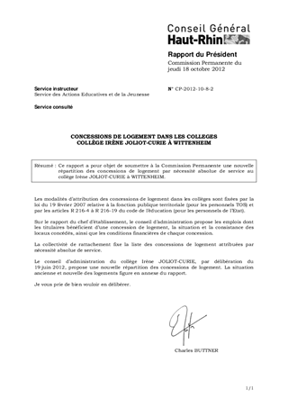 Ce rapport a pour objet de soumettre à la Commission Permanente une nouvelle répartition des concessions de logement par nécessité absolue de service au collège Irène JOLIOT-CURIE à WITTENHEIM.