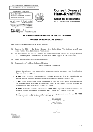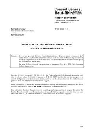 Il vous est proposé de voter l'individualisation de diverses aides prévues au B.P 2012: l'aide aux Comités départementaux, celle au titre du Fonds départemental d'aide à l'organisation de manifestations sportives et l'attribution de bourses pour les titulaires du BAFA-BAFD. Le total de l'enveloppe à engager dans ce rapport s'élève à 22 903 € en dépenses de fonctionnement.