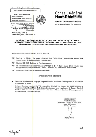 Le Département assure l’animation et l’élaboration technique du Schéma d’Aménagement et de Gestion des Eaux (SAGE) de la Lauch. Par courrier en date du 31 juillet 2012, la Direction Départementale des Territoires du Haut-Rhin demande un avis sur le projet de périmètre du SAGE de la Lauch et la désignation d’un représentant du Conseil Général du Haut-Rhin au sein de la future Commission Locale de l’Eau (CLE) qui sera chargée de l’élaboration du SAGE de la Lauch.