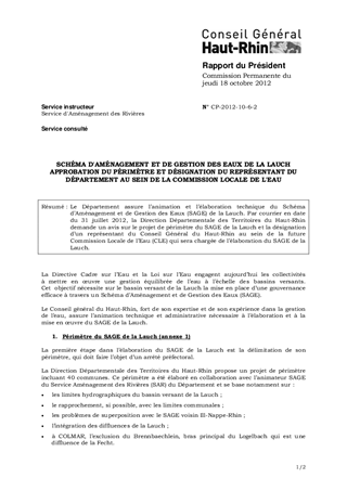 SCHÉMA D'AMÉNAGEMENT ET DE GESTION DES EAUX DE LA LAUCHAPPROBATION DU PÉRIMÈTRE ET DÉSIGNATION DU REPRÉSENTANT DU DÉPARTEMENT AU SEIN DE LA COMMISSION LOCALE DE L'EAU