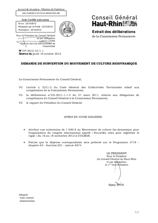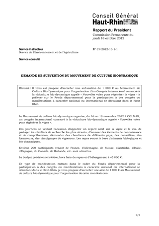 Il vous est proposé d’accorder une subvention de 1 000 € au Mouvement de Culture Bio-Dynamique pour l’organisation d’un Congrès international consacré à la viticulture bio-dynamique appelé « Nouvelles voies pour régénérer la vigne » à prélever sur le Fonds départemental pour la participation à des congrès ou manifestations à caractère national ou international se déroulant dans le Haut Rhin.