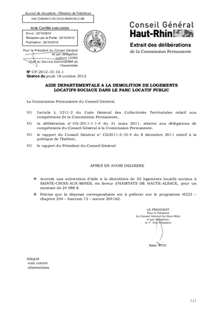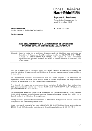 Dans le cadre de la politique départementale de l’Habitat, une opération de démolition de logements locatifs sociaux, menée par HABITATS DE HAUTE-ALSACE à SAINTE-CROIX-AUX-MINES, est éligible à une subvention départementale, pour un montant de 24 088 €, au titre de l’aide en faveur du parc locatif public.