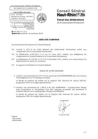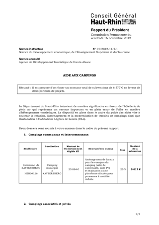 AIDE AUX CAMPINGS Resumé Il est proposé d'attribuer un montant total de subventions de 6 577 € en faveur de deux porteurs de projets. Pièces jointes DELIBERATION RAPPORT Assemblée : Commission Permanente Date : 16/11/2012 Rapporteur : Non défini Collectivité : Conseil départemental du Haut-Rhin Direction : Non défini Service : Service Développement Economique Domaine : Tourisme Commission : Commission Permanente