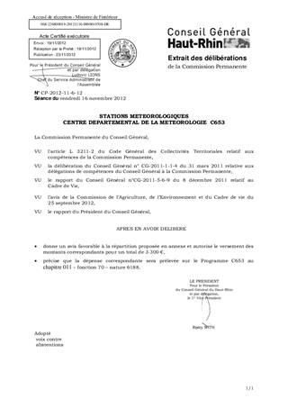 Dans le cadre du BP 2012, comme chaque année, un crédit de fonctionnement a été inscrit pour l’indemnisation des releveurs de mesures météorologiques. Il vous est proposé de répartir ce crédit conformément à la liste jointe en annexe et à l’avis de la Commission de l’Agriculture, de l’Environnement, du Cadre de Vie et de la Montagne du 25 septembre 2012.