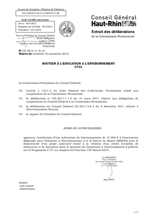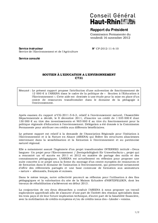 Le présent rapport propose l’attribution d’une subvention de fonctionnement de 12 000 € à l’ARIENA dans le cadre de la politique de « Soutien à l’Education à l’Environnement ». Cette aide est destinée à une étude pour la mise en place d’un centre de ressources transfrontalier dans le domaine de la pédagogie à l’environnement.