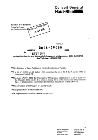 portant fixation des prix de journée hébergement et dépendance 2006 de l'EHPAD "Les Violettes" à MULHOUSE. Resumé Pièces jointes ARRETE Assemblée : Non défini Date : 06/02/2006 Rapporteur : Non défini Collectivité : Conseil départemental du Haut-Rhin Direction : Non défini Service : Service de la Tarification des Etablissements Domaine : Prix de Journée Commission :