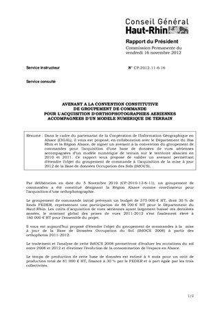 Dans le cadre du partenariat de la Coopération de l’Information Géographique en Alsace (CIGAL), il vous est proposé, en collaboration avec le Département du Bas Rhin et la Région Alsace, de signer un avenant à la convention du groupement de commandes pour l’acquisition d’une base de données de vues aériennes accompagnées d’un modèle numérique de terrain sur le territoire alsacien en 2010 et 2011. Ce rapport vous propose de valider un avenant permettant d’étendre l’objet du groupement de commande à l’acquisition de la mise à jour 2012 de la Base de données Occupation des Sols (BdOCS).