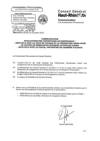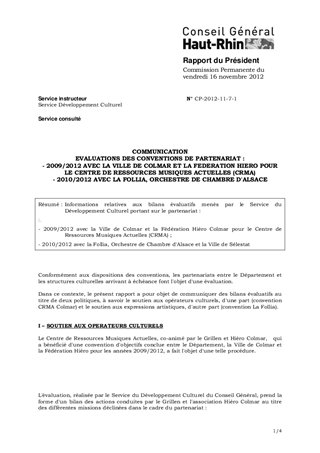 COMMUNICATIONEVALUATIONS DES CONVENTIONS DE PARTENARIAT :- 2009/2012 AVEC LA VILLE DE COLMAR ET LA FEDERATION HIERO POUR LE CENTRE DE RESSOURCES MUSIQUES ACTUELLES (CRMA)- 2010/2012 AVEC LA FOLLIA, ORCHESTRE DE CHAMBRE D'ALSACE