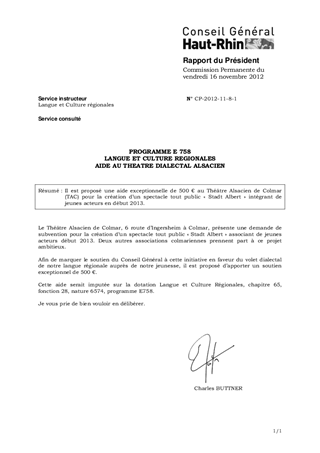Il est proposé une aide exceptionnelle de 500 € au Théâtre Alsacien de Colmar (TAC) pour la création d’un spectacle tout public « Stadt Albert » intégrant de jeunes acteurs en début 2013.