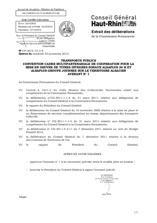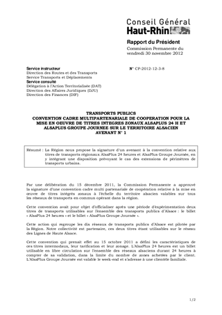 TRANSPORTS PUBLICS CONVENTION CADRE MULTIPARTENARIALE DE COOPERATION POUR LA MISE EN OEUVRE DE TITRES INTEGRES ZONAUX ALSAPLUS 24 H ET ALSAPLUS GROUPE JOURNEE SUR LE TERRITOIRE ALSACIEN AVENANT N° 1