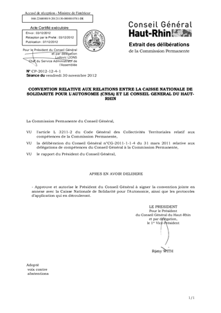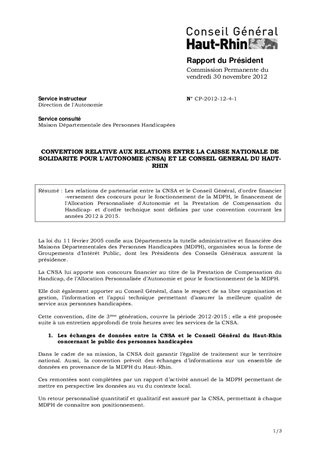 CONVENTION RELATIVE AUX RELATIONS ENTRE LA CAISSE NATIONALE DE SOLIDARITE POUR L'AUTONOMIE (CNSA) ET LE CONSEIL GENERAL DU HAUT-RHIN