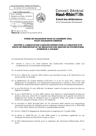 Le Fonds de Solidarité pour le Logement (FSL) intervient pour favoriser le maintien ou le rétablissement des fournitures d’énergie en accordant des aides financières ponctuelles aux personnes et aux familles en situation précaire. L’association Caroline BINDER propose la création d’un poste de travailleur social chargé de la prévention et de la médiation des impayés des fournitures d’énergie sur Colmar, en partenariat avec le FSL, les acteurs de terrain, les Espaces Solidarité Colmar Plaine et Vallées, le CCAS de la Ville de Colmar et VIALIS. L’objectif est d’assurer un suivi renforcé de ménages en difficulté, de diminuer le montant des impayés, de favoriser la reprise des paiements et, par conséquent, le montant éventuel des demandes d’aides auprès du FSL. Le coût de ce poste est fixé à 37 000 € en année pleine et prélevé sur le Fonds cofinancé du FSL sans coût supplémentaire pour le budget Départemental. Il est à signaler que cette action est indépendante des missions confiées à cette structure dans le cadre de l’Accompagnement Social Lié au Logement, car de nature différente. Compte tenu du soutien financier supplémentaire apporté par VIALIS et la CAF du Haut-Rhin notamment pour le développement d’actions de prévention dans le cadre du FSL, il est proposé de soutenir cette action par une convention de partenariat (du 1er décembre 2012 au 31 décembre 2015).