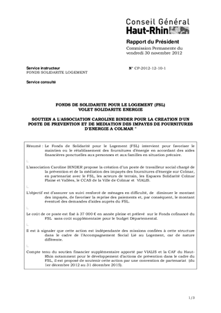 FONDS DE SOLIDARITE POUR LE LOGEMENT (FSL) VOLET SOLIDARITE ENERGIE SOUTIEN A L'ASSOCIATION CAROLINE BINDER POUR LA CREATION D'UN POSTE DE PREVENTION ET DE MEDIATION DES IMPAYES DE FOURNITURES D'ENERGIE A COLMAR