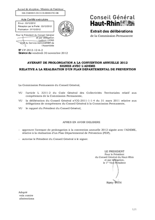 Le rapport propose d’adopter un avenant de prolongation à la convention annuelle 2012 signée avec l’ADEME, relative à la réalisation d’un Plan Départemental de Prévention (PDP) et d’autoriser le Président à le signer.