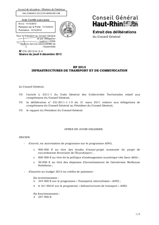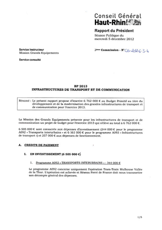 INFRASTRUCTURES DE TRANSPORT ET DE COMMUNICATION Resumé Pièces jointes DELIBERATION RAPPORT Assemblée : Conseil General Date : 05/12/2012 Rapporteur : Non défini Collectivité : Conseil départemental du Haut-Rhin Direction : Non défini Service : Direction des Routes Domaine : Transports / Routes Commission : Assemblée Départementale