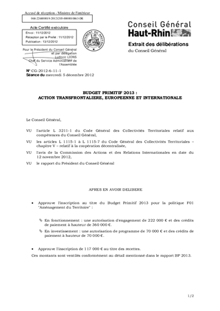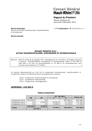 BUDGET PRIMITIF 2013 : ACTION TRANSFRONTALIERE, EUROPEENNE ET INTERNATIONALE