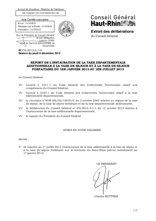 Dans le cadre des dispositions du Code Général des Collectivités Territoriales relatives à la taxe de séjour, l’Assemblée départementale a, lors de sa séance du 12 octobre 2012, décidé d’instaurer sur le territoire du Haut-Rhin une taxe additionnelle à la taxe de séjour et à la taxe de séjour forfaitaire à compter du 1er janvier 2013. Suite à la réunion de concertation du 19 novembre 2012 et afin d'assurer notamment l'information individuelle des hébergeurs dans des délais appropriés, permettant une bonne mise en oeuvre de cette taxe, il est proposé de reporter l'entrée en application de la taxe additionnelle, initialement fixée au 1er janvier 2013, au 1er juillet 2013.