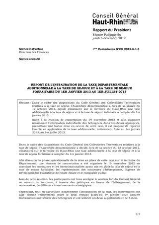 REPORT DE L'INSTAURATION DE LA TAXE DEPARTEMENTALE ADDITIONNELLE À LA TAXE DE SEJOUR ET À LA TAXE DE SEJOUR FORFAITAIRE DU 1ER JANVIER 2013 AU 1ER JUILLET 2013