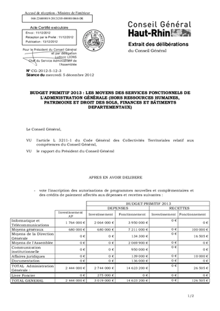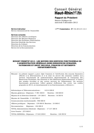 BUDGET PRIMITIF 2013 : LES MOYENS DES SERVICES FONCTIONNELS DE L'ADMINISTRATION GÉNÉRALE (HORS RESSOURCES HUMAINES, PATRIMOINE ET DROIT DES SOLS, FINANCES ET BÂTIMENTS DEPARTEMENTAUX)