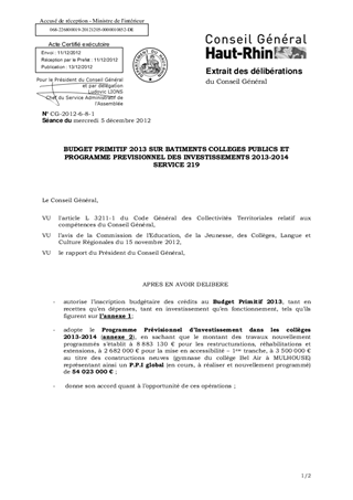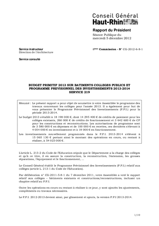 BUDGET PRIMITIF 2013 SUR BATIMENTS COLLEGES PUBLICS ET PROGRAMME PREVISIONNEL DES INVESTISSEMENTS 2013-2014 SERVICE 219