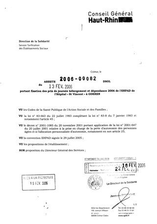 portant fixation des prix de journée hébergement et dépendance 2006 de l'EHPAD de l'hôpital "St Vincent" à ODEREN. Resumé Pièces jointes ARRETE Assemblée : Non défini Date : 13/02/2006 Rapporteur : Non défini Collectivité : Conseil départemental du Haut-Rhin Direction : Non défini Service : Service de la Tarification des Etablissements Domaine : Prix de Journée Commission :