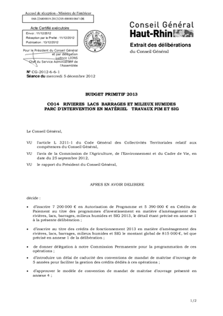 BUDGET PRIMITIF 2013 CO14 RIVIERES LACS BARRAGES ET MILIEUX HUMIDES PARC D'INTERVENTION EN MATÉRIEL TRAVAUX PIM ET SIG