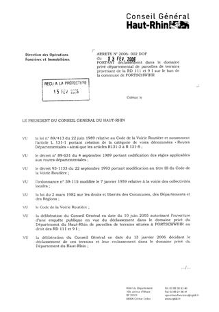 portant déclassement dans le domaine privé départemental de parcelles de terrains provenant de la RD 111 et 9 I sur le ban de la commune de FORTSCHWIHR. Resumé Pièces jointes ARRETE Assemblée : Non défini Date : 13/02/2006 Rapporteur : Non défini Collectivité : Conseil départemental du Haut-Rhin Direction : Non défini Service : Service du Patrimoine et du droit des Sols Domaine : Déclassement de voirie Commission :