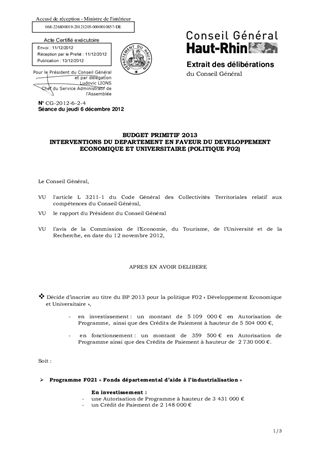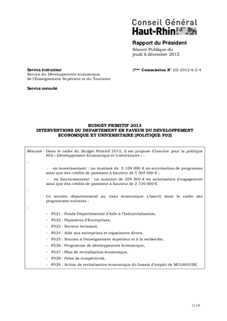 BUDGET PRIMITIF 2013 INTERVENTIONS DU DEPARTEMENT EN FAVEUR DU DEVELOPPEMENT ECONOMIQUE ET UNIVERSITAIRE (POLITIQUE F02)