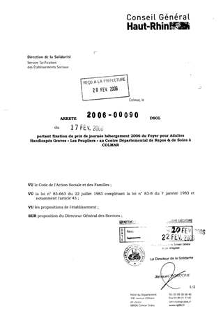 portant fixation du prix de journée hébergement 2006 du foyer pour adultes handicapés graves "Les peupliers" au centre départemental de repos et de soins à COLMAR. Resumé Pièces jointes ARRETE Assemblée : Non défini Date : 17/02/2006 Rapporteur : Non défini Collectivité : Conseil départemental du Haut-Rhin Direction : Non défini Service : Service de la Tarification des Etablissements Domaine : Prix de Journée Commission :