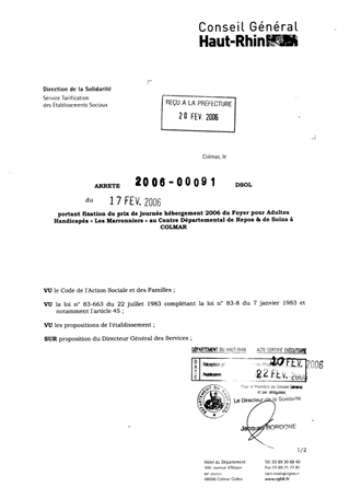 portant fixation du prix de journée hébergement 2006 du foyer pour adultes handicapés "Les Marronniers" au centre départemental de repos et de soins à COLMAR. Resumé Pièces jointes ARRETE Assemblée : Non défini Date : 17/02/2006 Rapporteur : Non défini Collectivité : Conseil départemental du Haut-Rhin Direction : Non défini Service : Service de la Tarification des Etablissements Domaine : Prix de Journée Commission :