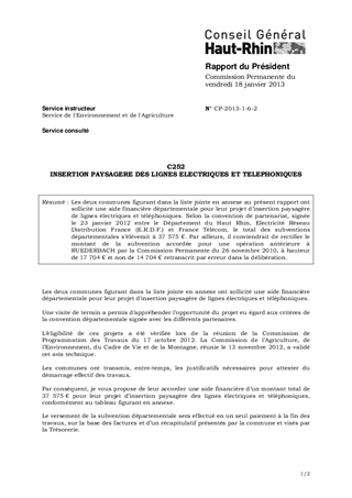 Les deux communes figurant dans la liste jointe en annexe au présent rapport ont sollicité une aide financière départementale pour leur projet d’insertion paysagère de lignes électriques et téléphoniques. Selon la convention de partenariat, signée le 23 janvier 2012 entre le Département du Haut Rhin, Electricité Réseau Distribution France (E.R.D.F.) et France Télécom, le total des subventions départementales s’élèverait à 37 575 €. Par ailleurs, il conviendrait de rectifier le montant de la subvention accordée pour une opération antérieure à RUEDERBACH par la Commission Permanente du 26 novembre 2010, à hauteur de 17 704 € et non de 14 704 € retranscrit par erreur dans la délibération.