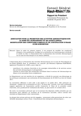 Dans le cadre du présent rapport, il est proposé de modifier les conditions d’emploi et de justification d’usage de la subvention de fonctionnement attribuée et versée en 2011 à l’Association Pour la Promotion des Activités Aéronautiques sur la zone de l’EuroAirport et en Alsace (APRAA).