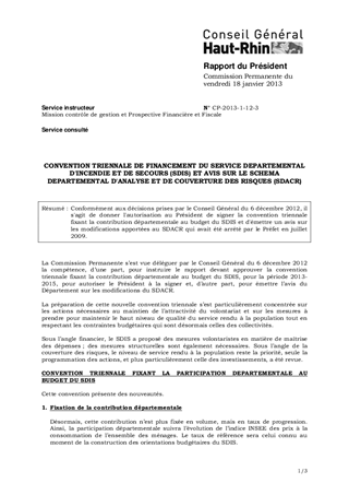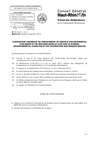 Conformément aux décisions prises par le Conseil Général du 6 décembre 2012, il s'agit de donner l'autorisation au Président de signer la convention triennale fixant la contribution départementale au budget du SDIS et d'émettre un avis sur les modifications apportées au SDACR qui avait été arrêté par le Préfet en juillet 2009.