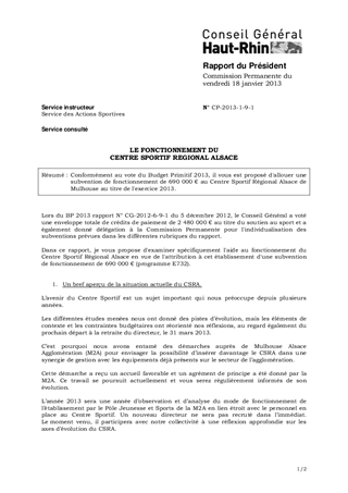 Conformément au vote du Budget Primitif 2013, il vous est proposé d'allouer une subvention de fonctionnement de 690 000 € au Centre Sportif Régional Alsace de Mulhouse au titre de l'exercice 2013.