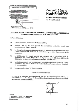 Le Congrès d'Alsace a confirmé le 24 novembre 2012, à une très large majorité, la volonté de ses membres, élus du Conseil Régional d’Alsace et des Conseils Généraux du Bas-Rhin et du Haut-Rhin, de constituer une nouvelle collectivité : la « Collectivité Territoriale d'Alsace ». Il est proposé au Conseil Général du Haut-Rhin d’approuver la résolution adoptée à l’occasion de ce Congrès et de lui conférer ainsi une valeur tant juridique que politique.