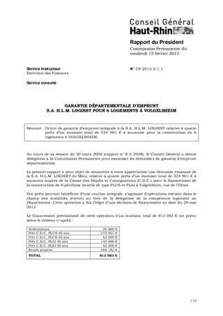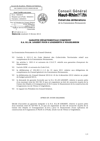 GARANTIE DÉPARTEMENTALE D'EMPRUNT S.A. H.L.M. LOGIEST POUR 6 LOGEMENTS À VOLGELSHEIM