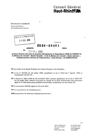 portant fixation des prix de journée hébergement et dépendance 2006 de l'EHPAD de la maison de retraite "Ste Famille" et de la maison de retraite "St Antoine", établissements relevant de l'Association "Louis Kremp" de RIBEAUVILLE. Resumé Pièces jointes ARRETE Assemblée : Non défini Date : 20/02/2006 Rapporteur : Non défini Collectivité : Conseil départemental du Haut-Rhin Direction : Non défini Service : Service de la Tarification des Etablissements Domaine : Prix de Journée Commission :